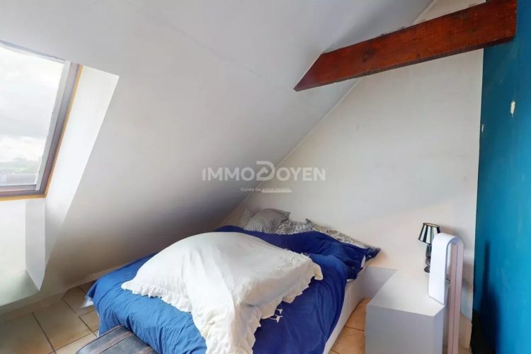 La distribution est claire et fonctionnelle : hall d’entrée, agréable séjour sous toiture avec multiples Velux, cuisine séparée, deux chambres bien proportionnées, grande buanderie indépendante, salle de bain avec douche, WC séparé.