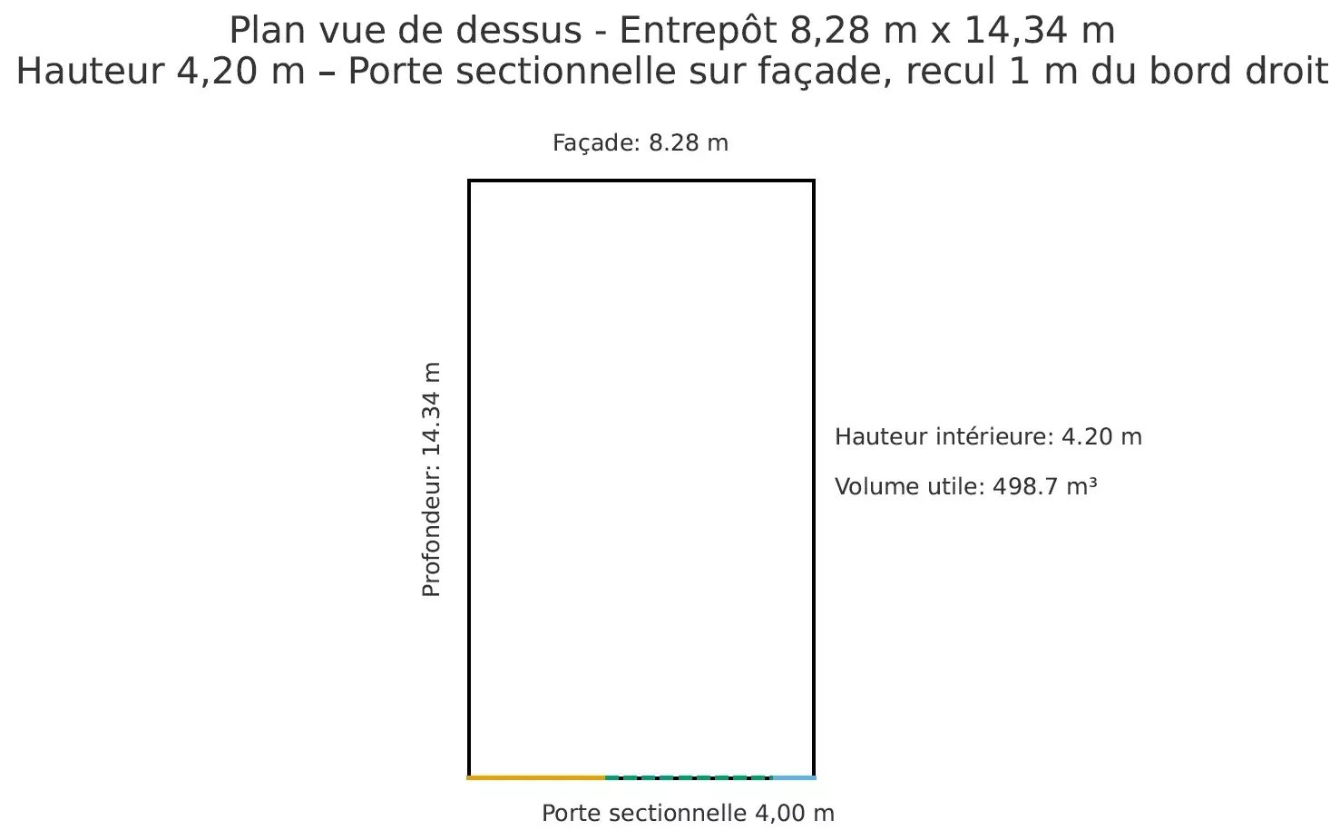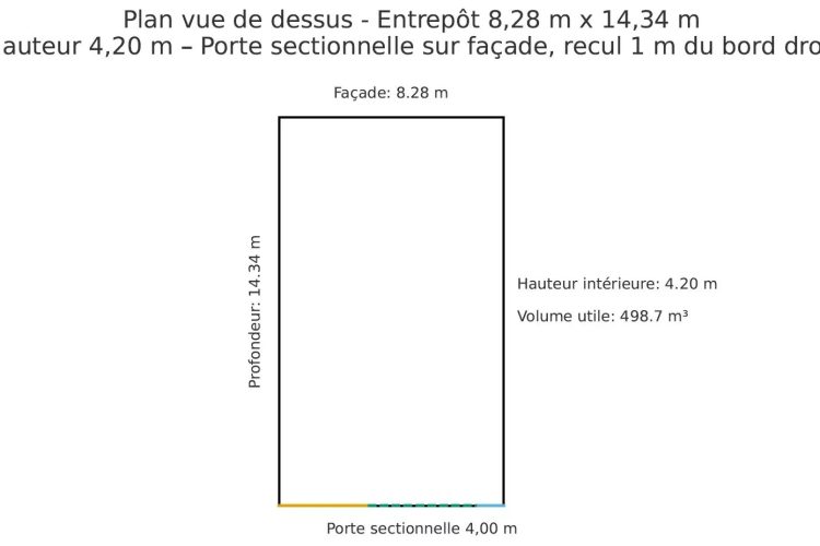 Situé au centre d’Arlon, cet entrepôt développe une surface au sol d’environ 118 m² (8,28 x 14,34) pour un volume d’environ 500 m³, avec une hauteur sous plafond de 4,20 m.