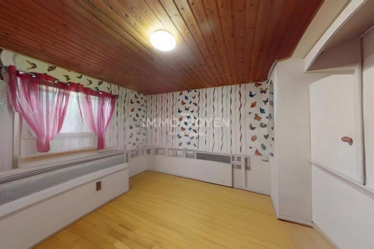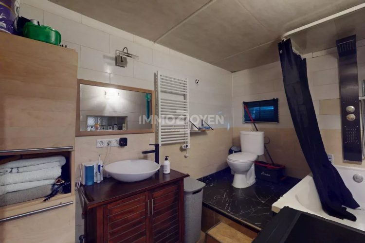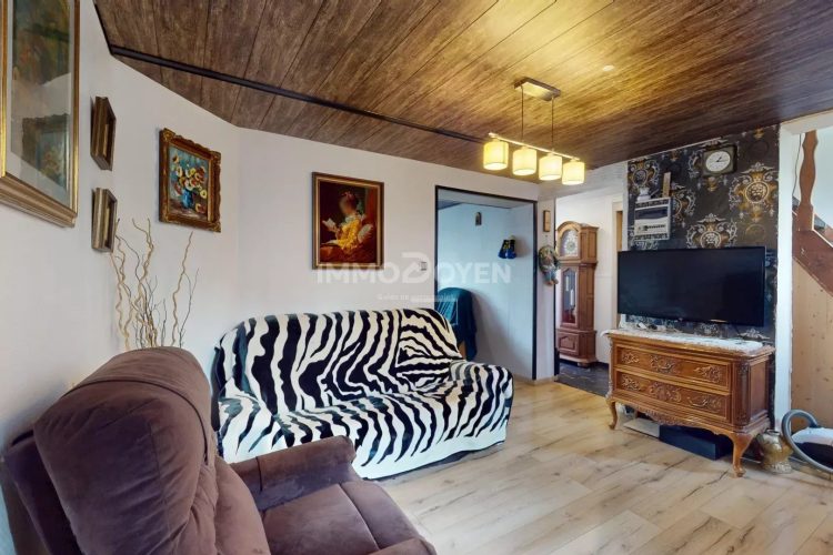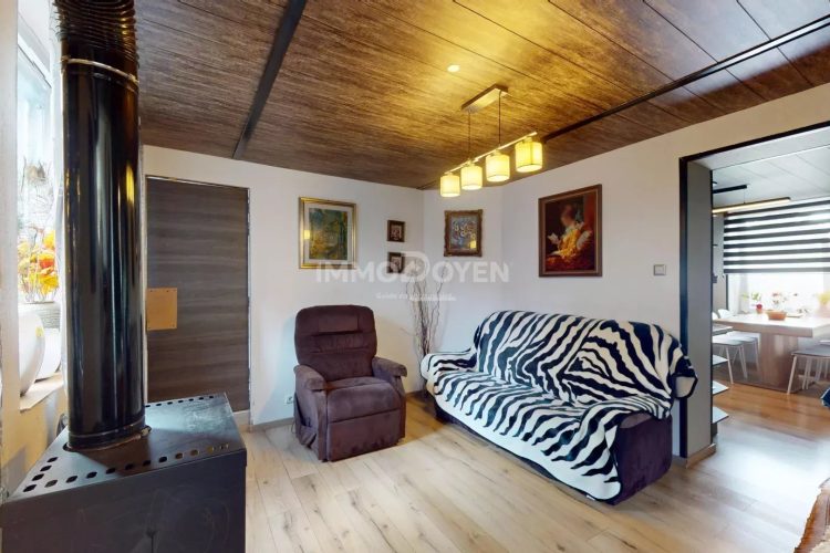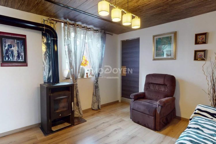 La salle de bain est équipée d’une baignoire, lavabo et WC. Le salon avec cheminée apporte une atmosphère chaleureuse, et la cuisine équipée est prête à l’emploi.